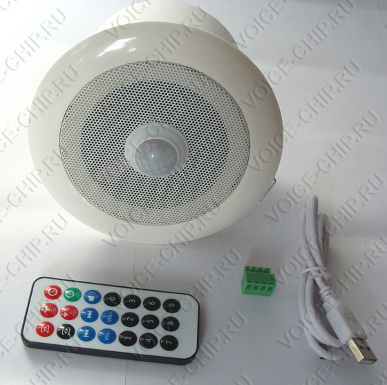 Комплект поставки: аудио информатор потолочный, дистанционный пульт управления, колодка подключения, USB-кабель для записи аудиосообщений.