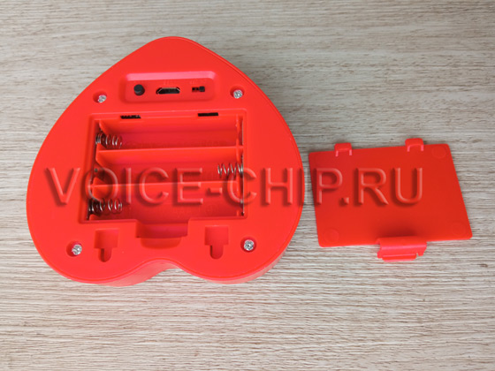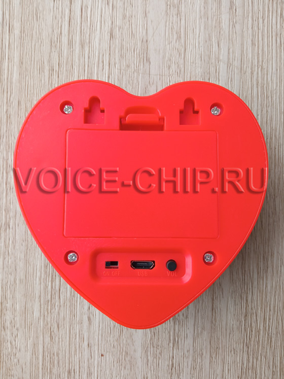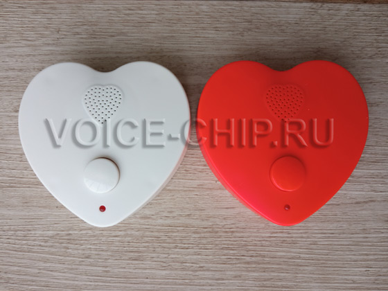 Звуковой модуль в форме сердечка с записью через USB разъем. Два цвета: красный, белый. Размер: 85*85*20 мм. Работает от трёх батареек размера ААА (в комплект не входят). mp3-файлы записываются через microUSB разъём. Объём памяти 4 Мбайта, достаточен, чтобы записать примерно до 8..15 минут. Воспроизведение включается кнопкой на корпусе. Возможны 6 режимов работы кнопки. Нужный режим выбирается с помощью файла конфигурации. Громкость звука регулируется кнопкой на задней стороне корпуса, там же есть переключатель вкл./выкл.