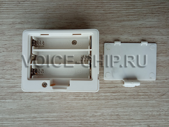 Маленький звуковой информатор IV2022IKD с датчиком движения. Может использоваться для шкафов, небольших мусорных баков (вуковое сопровождение при выбрасывании мусора). Размер 60*48*26 мм. Работает от трёх батареек ААА (в комплект не входят) или от внешнего источника 5 В через microUSB разъём. Мощность аудио 1,5 Вт. Регулировка громкости с помощью файла конфигурации. Воспроизведение включается от датчика движения. Дальность действия датчика ~3 м в секторе 120 гр. mp3-файлы записываются через microUSB разъём. Объём памяти 4 Мбайта, достаточен, чтобы записать примерно до 8..15 минут.
