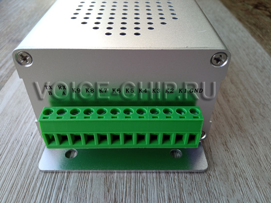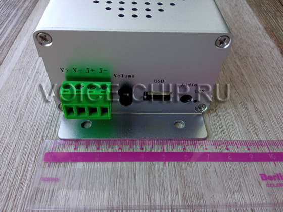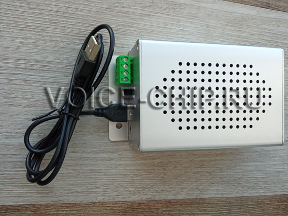 Информатор металлический промышленный с 9 входами управления Качественное громкое звучание. Мощность аудио 10 Вт. Имеется ручной регулятор громкости. Питание от источника 6 ...35 В. Размеры: 145*75*47 мм. На корпусе имеются скобы с отверстиями для монтажа. Запись mp3-файлов через USB-разъём. Воспроизведение включается подачей сигналов или замыканием контактов на одном из 9-ти входов. Каждый вход можно настраивать на один из 15-ти режимов работы с помощью файла конфигурации. Возможность управления командами через последовательный порт Rx/Tx. - три варианта работы - уточняйте при заказе: 1) TTL serial port, 2) RS232, 3) RS485. Имеется Выход для подключения внешних устройств, с напряжнением 12В, например сигнальной лампы. Выход активен во время воспроизведения Объём памяти 8 Мбайт, достаточен, чтобы записать примерно до 15..30 минут. Разъём аудиовыхода 3,5 мм для подключения внешнего динамика или усилителя.