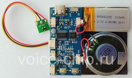 Параметры модуля: Звуковой модуль с многократной записью (перезаписываемый). Размер: 66*57*6 мм Нижняя поверхность - самоклеящаяся. Объем памяти модуля - 16 Мбайт. Максимальная длительность звучания ~120 минут.** Поддерживаемый битрейт mp3-файла 8..320 кбит/сек. Можно записать несколько mp3-файлов и можно записать звук через встроенный в модуль микрофон. Разъем для подключения к компьютеру - Type-C