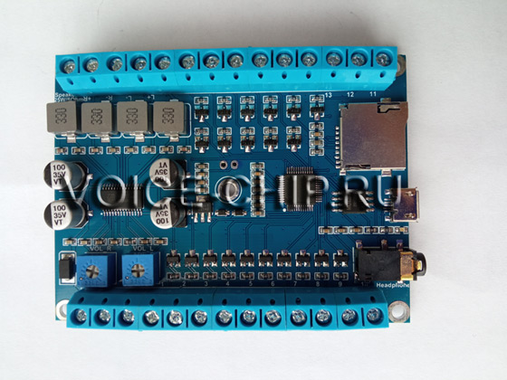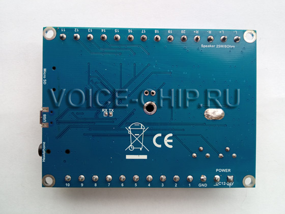 Применяется для информационных стендов, обрудование по программе "Доступная среда", для демонстрационных макетов и экспонатов. Возможности и параметры модуля PM2025U: • Воспроизводит mp3 или WAV-файлы из встроенной памяти (16 Мбайт) или с карты памяти micoSD. • Аудиочип с 24-х разрядным преобразователем (DAC) обеспечивает качественное звучание. • Выходная мощность встроенного усилителя D-класса 2*25 Вт (стерео). Аудиовыходы рассчитаны на динамик 8 Ом. • Возможность подключения внешнего усилителя через разъём Line out. • Регулировка громкости каждого канала - подстроечным резистором с помощью отвёртки. • Четыре различных режима работы входов, выбираемых с помощью файла конфигурации. • Напряжение питания DC 9..24 В. • Размер 80*60*12 мм. Пять крепёжных отверстий диаметром 3 мм. • Клеммная колодка с винтами для подключения проводов без пайки.