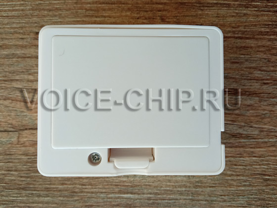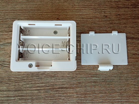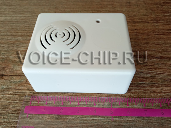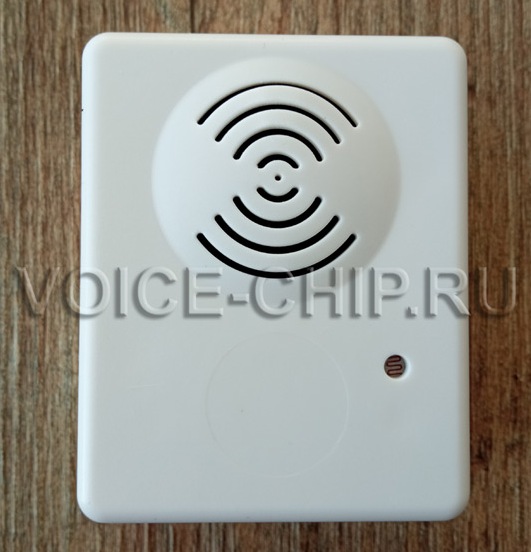 Маленький звуковой модуль со световым датчиком. Размер 60*48*26 мм. Работает от трёх батареек ААА (в комплект не входят) или от внешнего источника 5 В, через microUSB разъём. Мощность аудио 1,5 Вт. Регулировка громкости в файле конфигурации. mp3-файлы записываются с помощью компьютера через microUSB разъём. Объём памяти 4 Мбайта, достаточен, чтобы записать примерно до 8..15 минут. Воспроизведение включается при попадании света на датчик. Изначально модуль должен находиться в темноте. Подходит для использования в шкафу, большой коробке, холодильнике, кладовке.