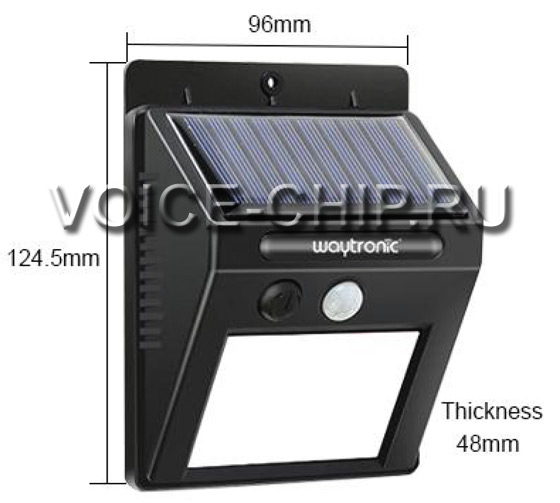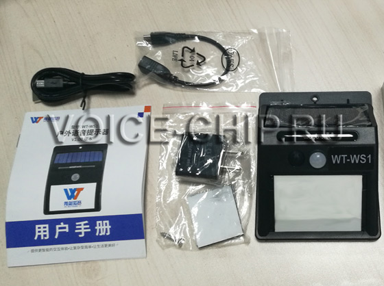 Звуковой уличный информатор WT-WS1 с солнечной панелью и датчиком движения Размер 125*96*48мм. Соответствует стандарту влагозащищённости IP43. Крепится на вертикальную поверхность, солнечная панель всегда обращена вверх. Встроенная LiOn батарея 2 А*ч. При достаточном количестве солнечного освещения может работать полностью автономно. Также может работать от внешнего источника 5 В. Выходная аудио мощность 2 Вт. Всё управление, в т.ч. реуглировка громкости - одной кнопкой на корпусе. Воспроизведение включается от датчика движения. Дальность действия датчика ~4 м. Два режима работы - циклическое и однократное воспроизведения. mp3-файлы загружаются во встроенную память с помощью флэш накопителя (флэшки). Нет необходимости подсоединения к компьютеру. Объём памяти 4 Мбайта, достаточен, чтобы записать примерно до 8..15 минут