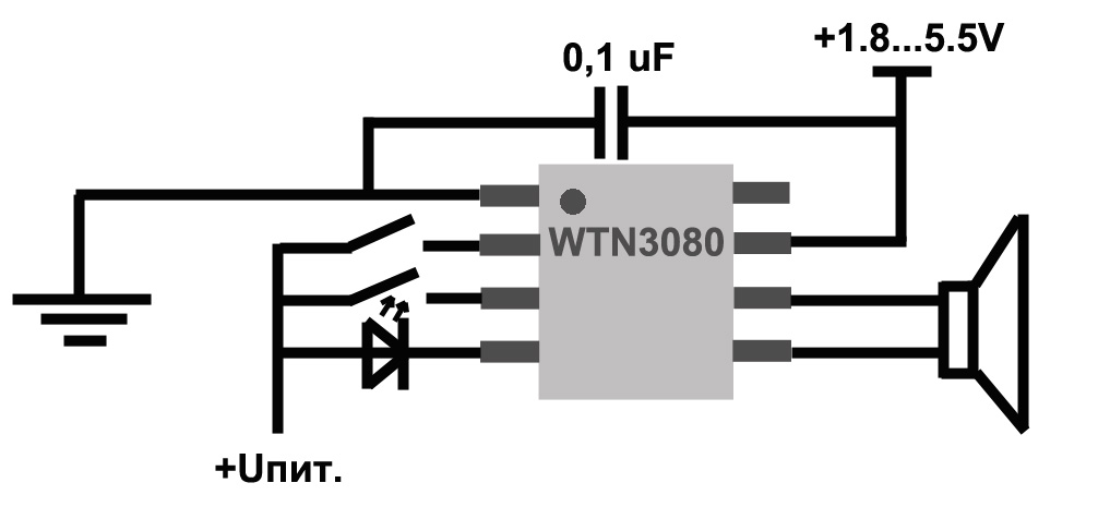 Звуковая микросхема WTN занимает минимум места на печатной плате и не требует дополнительных компонентов для работы. Динамик можно подключать напрямую к выводам микросхемы WTN.